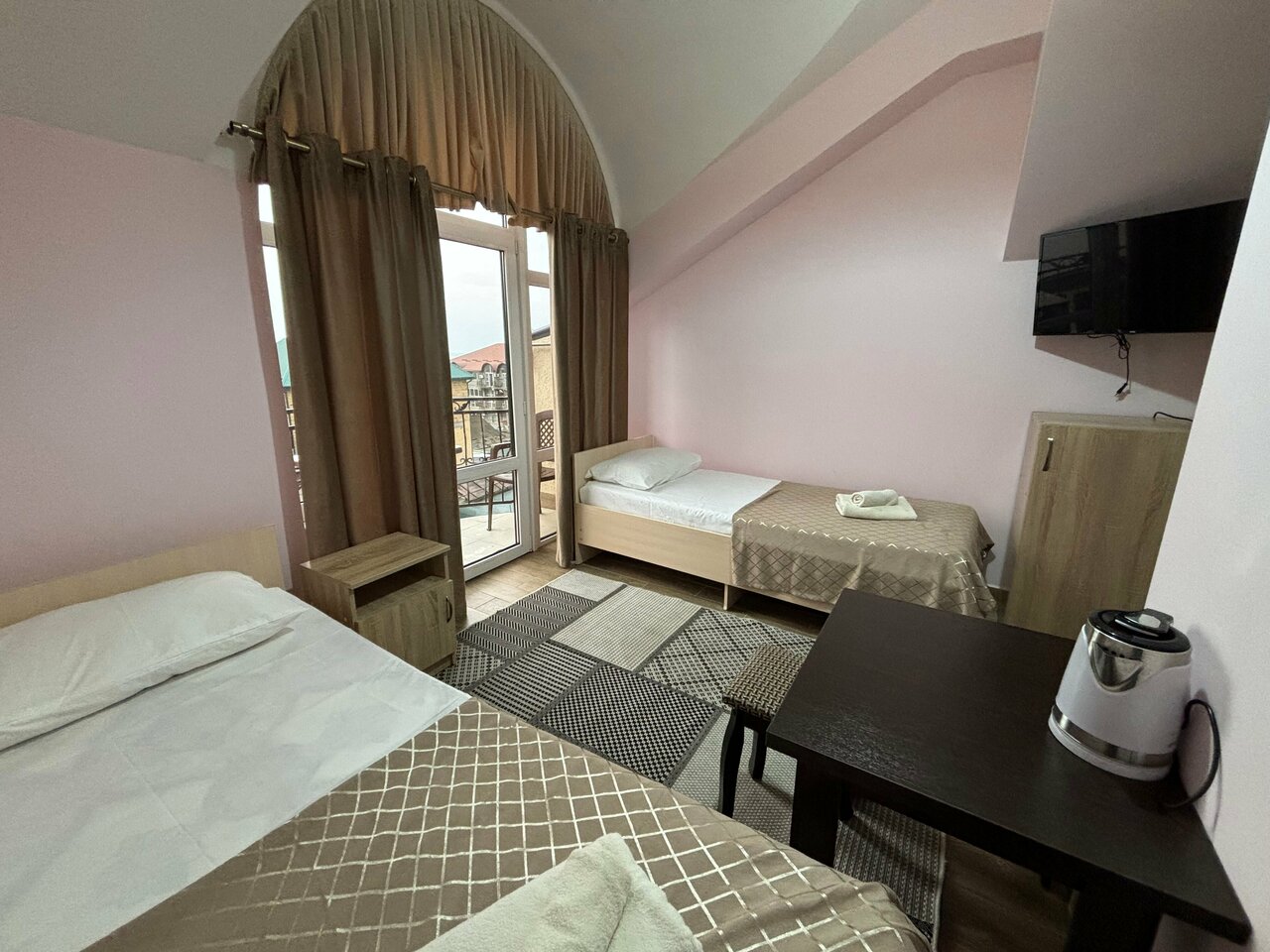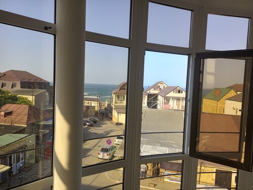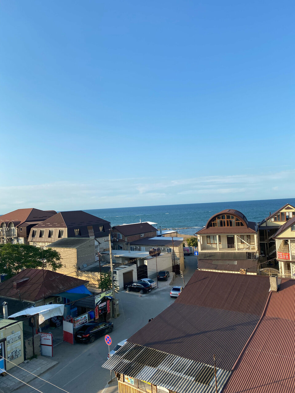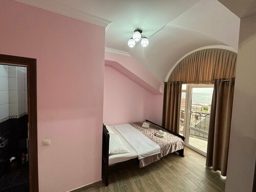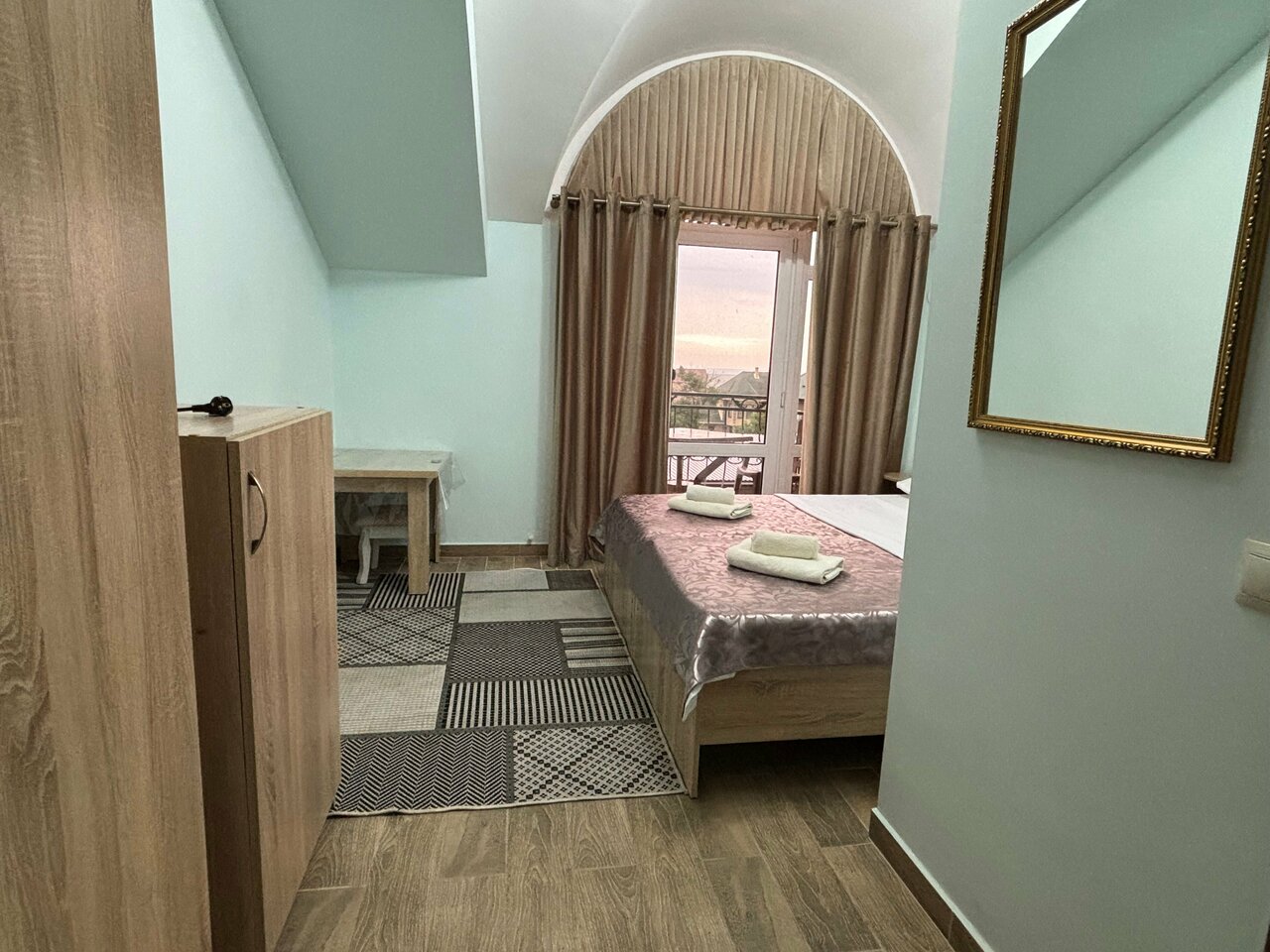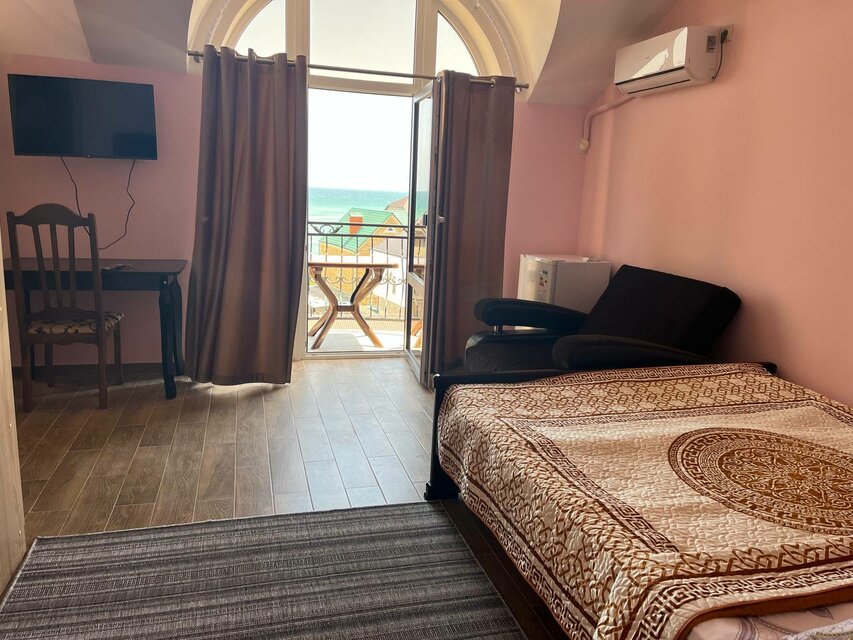 Шикарный номер, прекрасный вид с балкона. Магазин и столовая на минус первом этаже, море реально в двух минутах до пляжа