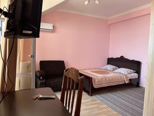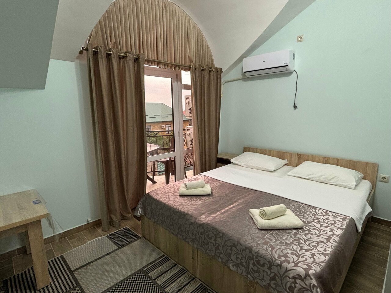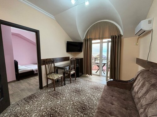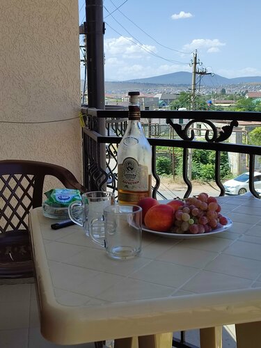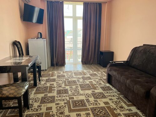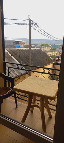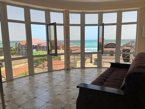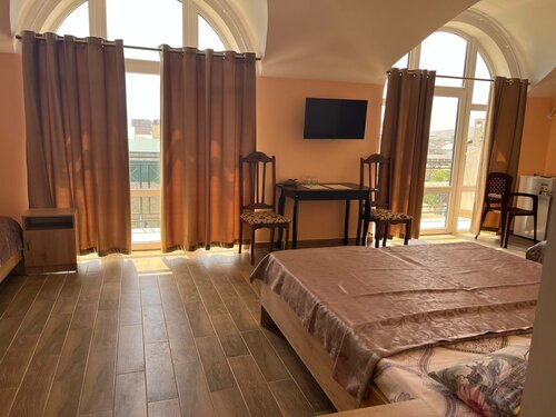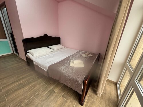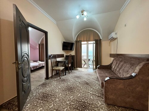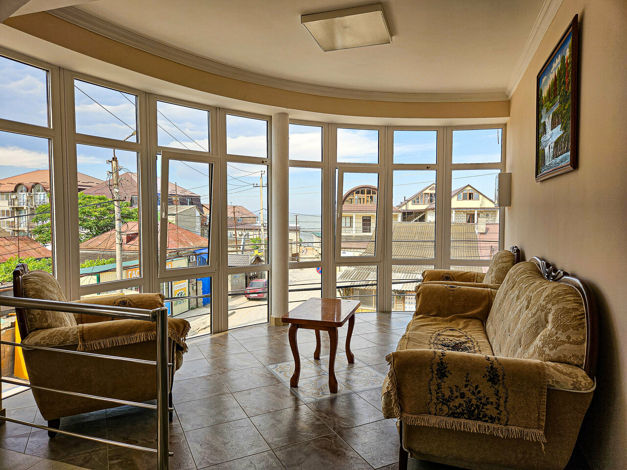 Шикарный номер, прекрасный вид с балкона. Магазин и столовая на минус первом этаже, море реально в двух минутах до пляжа